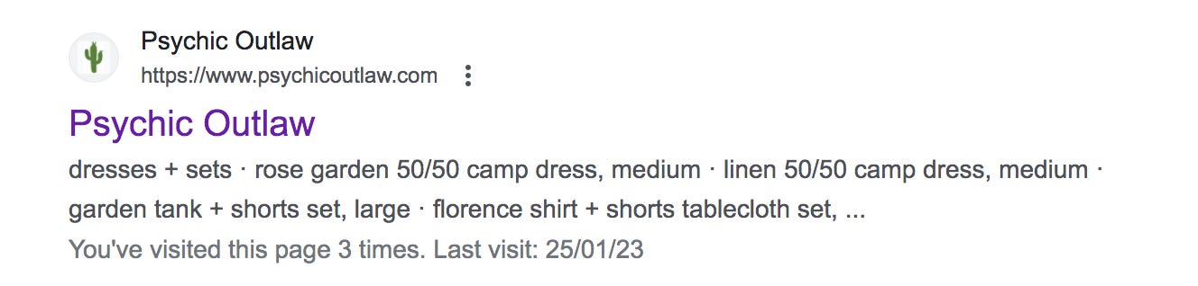 *Note that these character counts are not hard-and-fast rules - you’ll see in Shopify’s settings that they allow you to enter far longer descriptions, for example - but know this: the further you go past Google’s recommended character counts, the more likely they are to scrap your meta copy and choose different text from the page to display in search results. That’s why you’ll sometimes see super-random, or cut-off, copy in some of Google’s search results, like so: