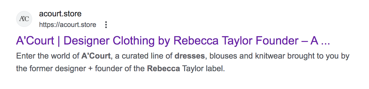 Because you have a few more characters to work with in the meta description, it’s a great spot to include any relevant info (or keywords!) that you think users may be looking for. For example, A’Court - a new brand founded by Rebecca Taylor - includes her name in their homepage’s meta description, since she’s a person of interest in the fashion world: